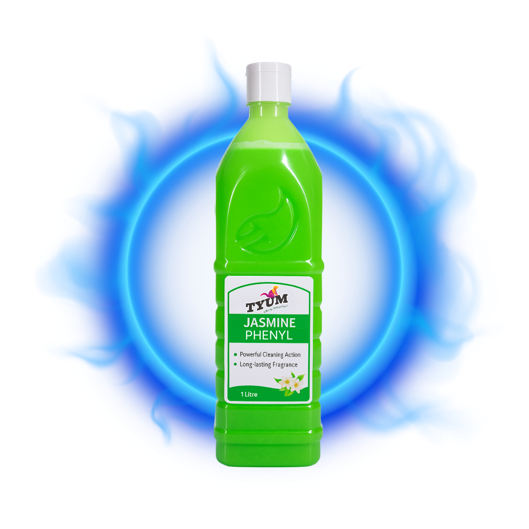 Tyum Jasmine Phenyl is a disinfectant floor cleaner that removes stains and 99.9% of germs while leaving a calming jasmine fragrance. Safe, non-sticky, and ideal for homes and institutions.